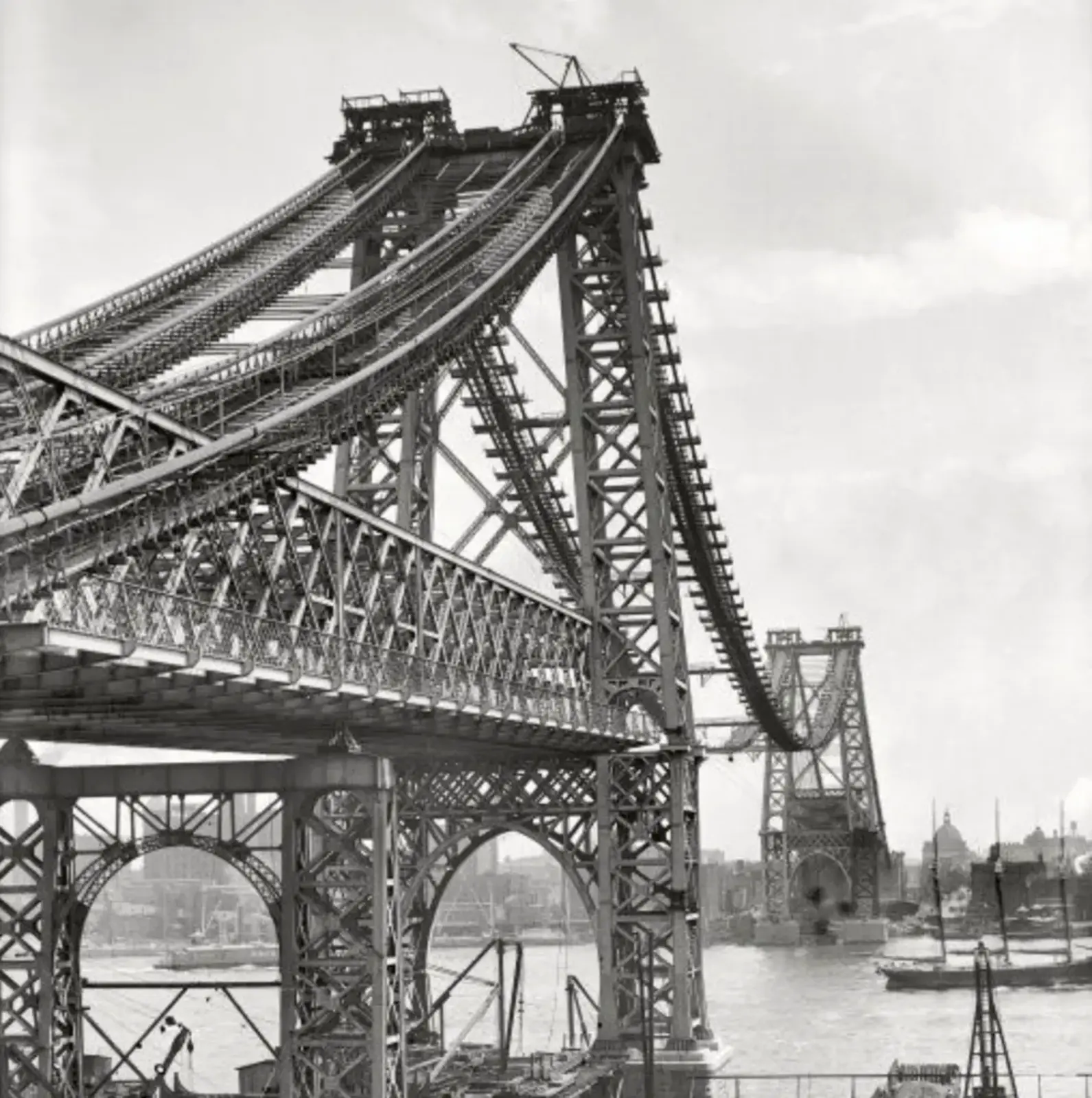 There are popular 2 way bike lanes on this bridge - yes, there are an increasing number of micromobility devices and eBikes alongside the bikes. The south side is popular with pedestrians and runners. It takes 5-8 minutes to cross this 1.35 mile / 2 km on bicycle, and it's usually refreshing due to the views as you soar over the East River. Image from Wikipedia during construction.