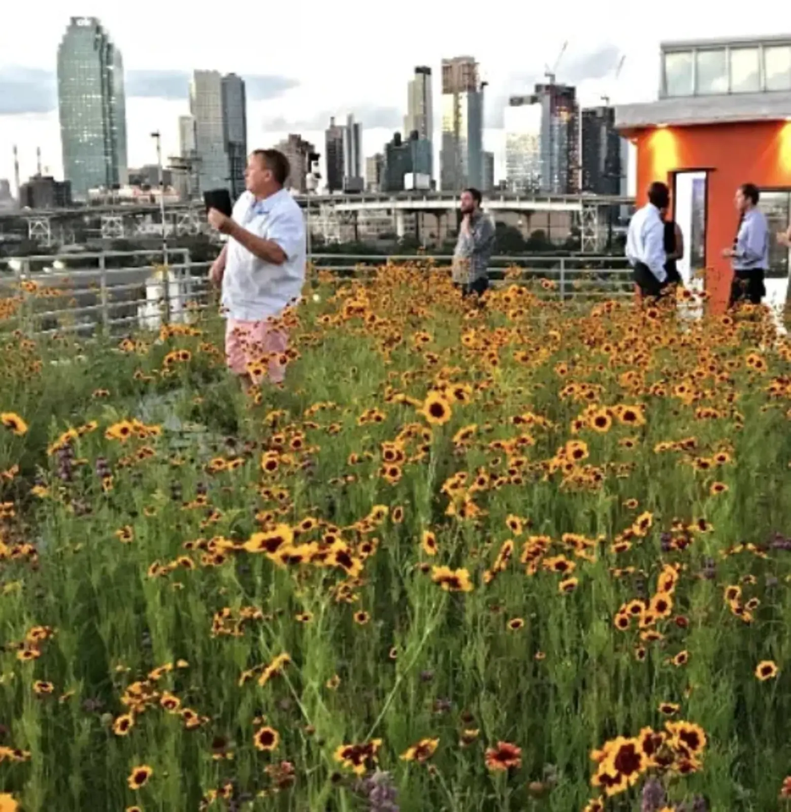 Community space on the roof! Green Roofs cool the air, absorb stormwater, provide habitat and so much more that benefit the climate and environment. While there is no food for Humans, there is a banquet for pollinators. Bonus: from this roof, you can see others that are green!
